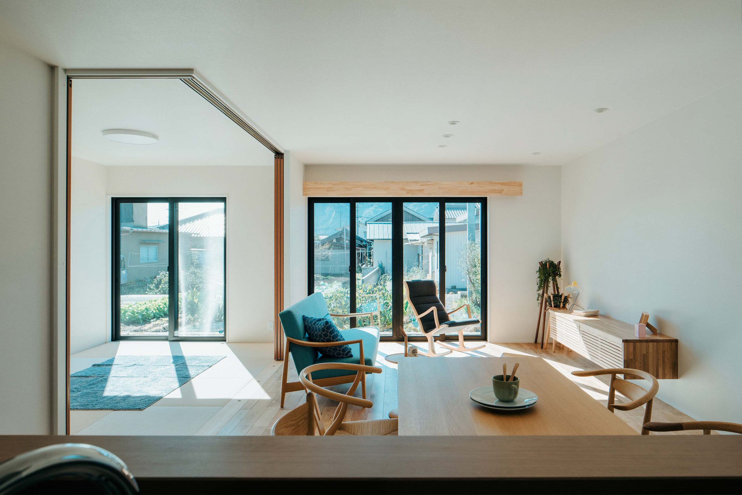 ガルバリウム剛板を外壁材に用いた注文住宅です。リビングに設けられた大開口の掃き出し窓からたっぷりと日差しが差し込みます。天気が良ければ日中は照明を必要としないでしょう。キッチン横に奥様専用の小上がり書斎を設けている点もポイントです。家事の手を休めるときに、自分だけの時間を楽しめます。(2022年時点/Tamada工房公式サイトより)